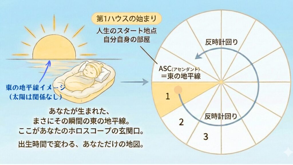 ホロスコープでは、東の地平線(ASC=アセンダント)を起点として1ハウスが始まります。